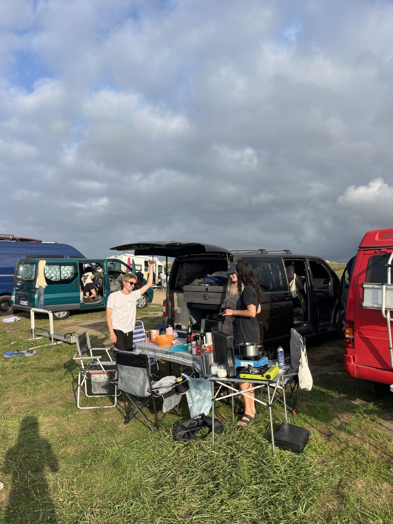 Bon dia Cantabria! Ens hem llevat a la Platja de Berria i hem esmorzat amb en Tim i la Lilli. Danach sind wir zu einem anderen Mecanica fahren. Dieses mal hatten wir Glück! Der Mecanicker reparierte Brownie, aber wir müssen morgen die baterie laden. But no problem because we went to Playa de Guerre with Shivel, Lilli and Tim; got a nice parking spot, surfed (well not Heide because she had to rest to get better) and had a nice delicious dinner (that we did not either had to cook or clean thanks to our nice campong van neighbours shout out Tim and Lilli). Después jugamos a Bonhanza (Sandra did not win of course) y a Wizard (and Tim fucked with everyone all the time, specially Heide). We went to sleep in a cozy van bed ready for the next day 🏄🏻♂️